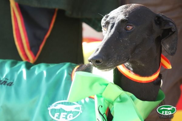 La plaza de Nava del Rey albergaba la entrega de trofeos y distinciones federativas a todas y cada una de las agrupaciones o instituciones que han hecho posible desarrollar este bonito Campeonato, amén de a los dos galgos finalistas, que en honor a multitudes iban subiendo al escenario a recibir tan merecidos reconocimientos. El Campeón se vestía de gala con la corbata y manteleta Nacional y Pícara de Morix lo hacía de verde para lucir subcampeonato.