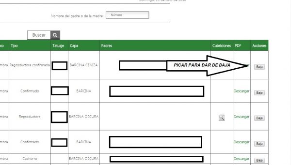 - Elegir el animal al que se quiere dar de baja, de los que tenemos en nuestros productos y pulsar en el botón «BAJA», tal y como viene en la imagen. El programa nos preguntará si estamos seguros en dar de baja el mismo y si es así, pulsaremos el botón «aceptar».