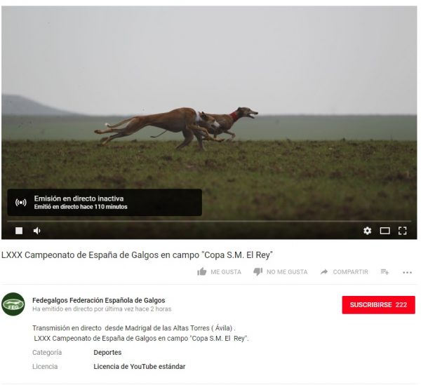 Es decir, todos los aficionados del galgo, en cualquier rincón del mundo con conexión a internet, podrá seguir la Presentación del Campeonato de España, Los octavos de Final, Los Cuartos de Final, Las Semifinales y la Gran Final del LXXX Campeonato de España de Galgos en Campo.