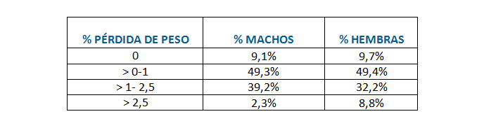 En la siguiente tabla podemos observar la distribución de las pérdidas por deshidratación en galgos tras la carrera. Estudio sobre 2552 carreras (Blythe et Al. 1986).