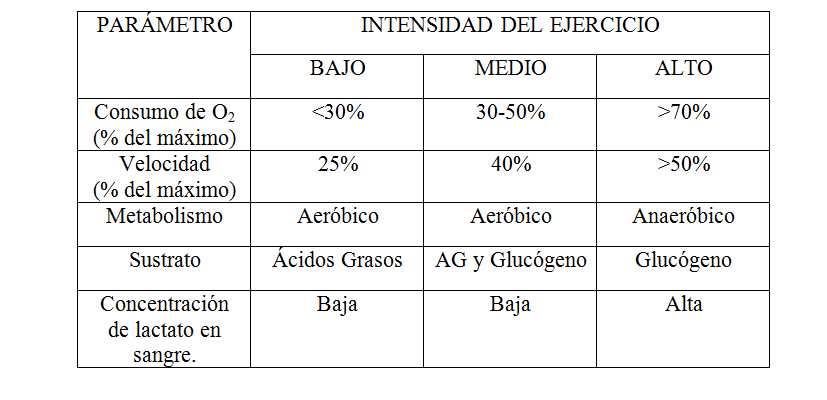 En la siguiente tabla resumen, se puede observar el diferente consumo de oxigeno, el tipo de metabolismo empleado, así como el sustrato del que se obtiene, en función de la intensidad del ejercicio. Esto puede servir de ayuda y orientación a la hora de planificar un entrenamiento.
