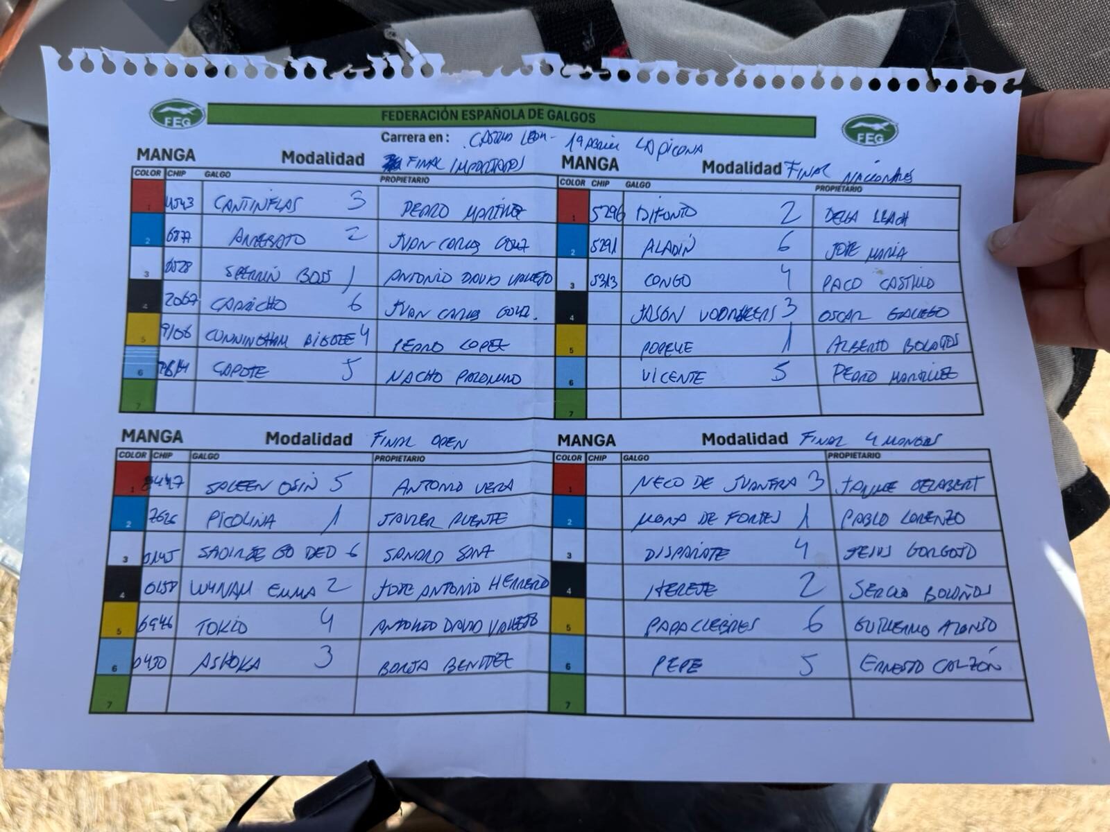 Después de un control veterinario realizado con rapidez, la competición empezó puntual como un reloj inglés a las 9:30h. a medidas que se iban disputando las carreras se iban quedando clasificados los mejores perros de cada modalidad, llegando a la 13:30 a finalizar las finales que quedaron de la siguientes manera :