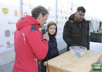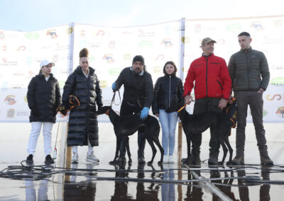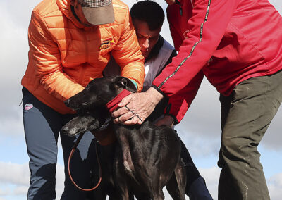 A las 10:30 h, los facultativos veterinarios chequeaban a las perras y daban el okey a la aptitud de las dos finalistas. Seguidamente se producía el sorteo de collarines quedando con collar rojo Chirivía de Morix y con collar blanco la galga de la tierra Morería de Suerte. Unos minutos después las galgas se presentaban a la afición, a la espera tensa de que se iniciara la parte deportiva.