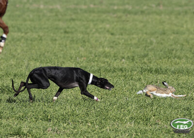 Tras el descanso pertinente las galgas volvían al aparato y la afición local no perdía la esperanza de que su representante levantara la eliminatoria. A las 16:54 saltaba la tercera liebre de la jornada, muy cerquita de donde se situaba toda la afición galguera, pudiendo disfrutar de forma privilegiada la victoria en este caso con 3 pañuelos blancos, de la galga de la Tierra Morería de Suerte.