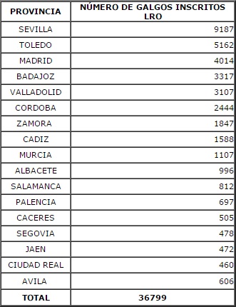 En la derecha les adjuntamos una tabla con el número de galgos activos, inscritos en el Libro de Registro de Galgos de la FEG, en cada una de las provincias.