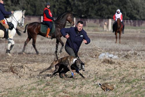 A las 11:15 horas la mano echaba a andar y las primeras liebres no tardaron en aparecer, desperdiciando un gran número de ellas. Poco a poco las cosas se iban calmando y las rabonas iban apareciendo en menor cantidad, pero con una calidad exquisita que ponían a los galgos en serios aprietos para dominar a las mismas. La afición pudo disfrutar desde el balcón donde se sitúa la carpa de unas carreras preciosas, pasando alguna de ellas a escasos metros de la misma. Cuando la mano se alejó del cerro, las pantallas en directo de la carpa y la retransmisión en streaming que se está haciendo del campeonato acercaba el espectáculo a todos los allí presentes y a los que desde casa, querían seguir nuestro deporte.