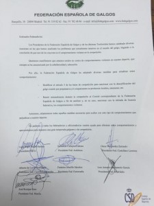 Después de cuatro largas reuniones en los últimos meses, el presidente de la FEG, D. Luís Angel Vegas Herrera y los presidentes de todas y cada una de las territoriales galgueras, fimaron ayer en Madrid un manifiesto con medidas concretas para atajar en nuestro deporte cualquier tipo de comportamiento violento. Para ello se han tomado medidas concretas que dentro de la legalidad, erradiquen dichas prácticas que desgraciadamente se estaban produciendo.