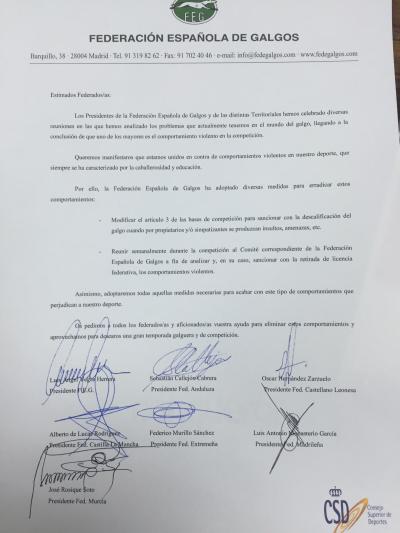 Como pueden comprobar, el espíritu de este manifiesto, que ha unido a todas y cada una de las federaciones galgueras es acabar de una ver por todas con los comportamientos que tanto daño están haciendo a nuestro deporte, marginando y sancionando de forma implacable a los que decidan seguir esta vía del insulto, la amenaza o la coacción.