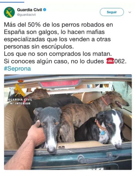 Esta misma semana, la propia guardia civil a través de las redes sociales oficiales del Servicio de Protección de la Naturaleza, constataba que el 50% de los todos los perros que se roban al año en España son galgos, que lo hacen mafias organizadas y que la mayoría de esos galgos son los que posteriormente aparecen abandonados o maltratados por estas personas sin escrúpulos. Agradecemos además, el apoyo de la Federación Española de Caza, que está teniendo con su federación hermana, yendo de la mano en comunicados y acciones que ayuden a defender nuestras aficiones ante el ataque de los sin razón.