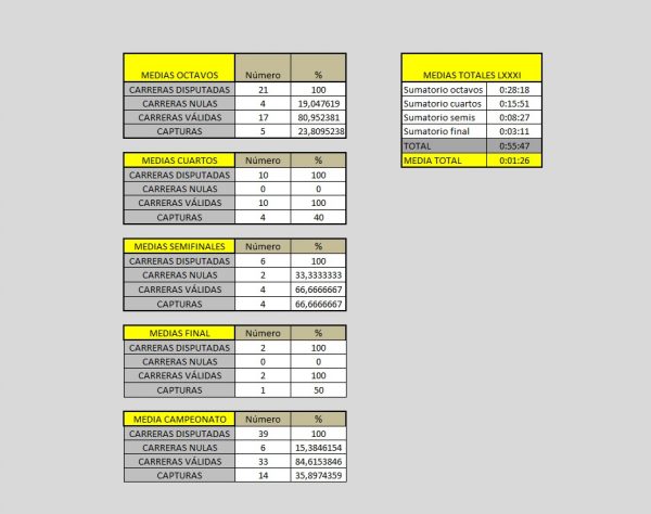 – De esas 39 liebres, 33 carreras han sido válidas (84,6%) y solo 6 han sido nulas (15,4%) lo que supone también la segunda mejor estadística de los últimos 10 años y de las mejores de la historia de nuestro deporte.