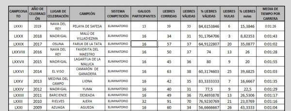 – Como novedad y sin que sirva de precedente, ya que en nuestro deporte la captura de las liebres es totalmente anecdótica y muy poco puntuable, se han contabilizado las liebres capturadas. Han sido un total de 14 de esas 39, lo que supone que el 65% de las liebres corridas han sido superiores a los mejores galgos de España y han puesto su vida, felizmente a salvo. Este dato, hace callar muchas voces que se pronunciaron en contra de la decisión de la FEG de disputar este año y en Nava del Rey, la fase final del Nacional y da la razón absoluta a nuestra institución, de que la decisión era acertada y estaba fundamentada en la buena salud de los lepóridos en la comunidad de Castilla y León y concretamente en el acotado elegido.