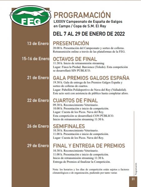 El sábado 22 de Enero, están citados los galgos participantes a las 9:30 horas de la mañana, posteriormente se realizará la presentación de los galgos a la afición y seguidamente se iniciará la competición una vez que el estado del terreno esté en óptimas condiciones para la práctica de nuestro deporte.