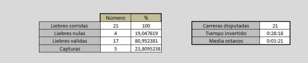 Por último veamos las estadísticas que nos arrojan las magníficas liebres de Nava. Nunca la FEG aporta datos sobre las capturas, pero en la presente edición y sin que sirva de precedente,  lo hacemos público con la única intención de demostrar  que la liebre de Nava del Rey está en un estado de salud envidiable y que el porcentaje de capturas (23,8 %) es bastante más inferior al de  cualquier otro campeonato de los últimos años.