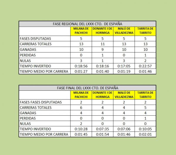Vayamos ahora con la información que nos puede aportar datos muy interesantes de las verdaderas protagonistas de la competición. Comencemos por las dos perras andaluzas.
