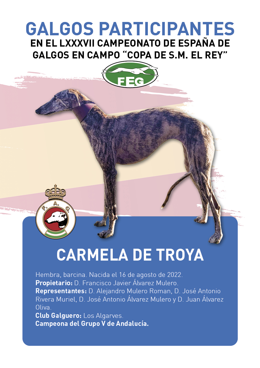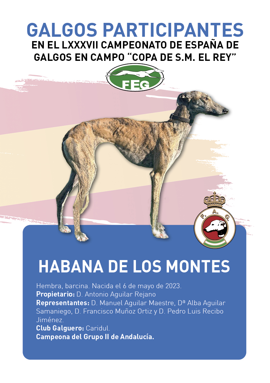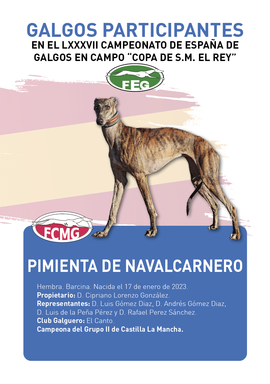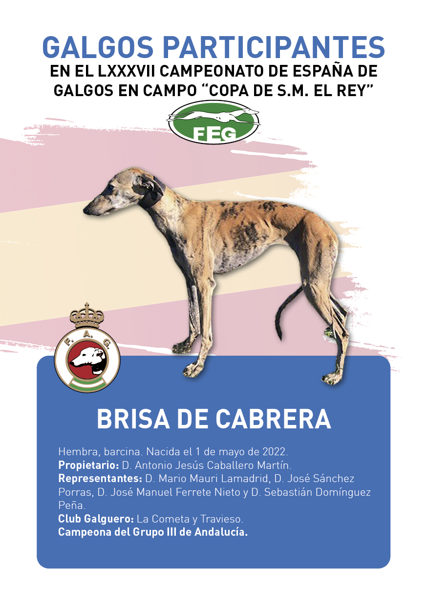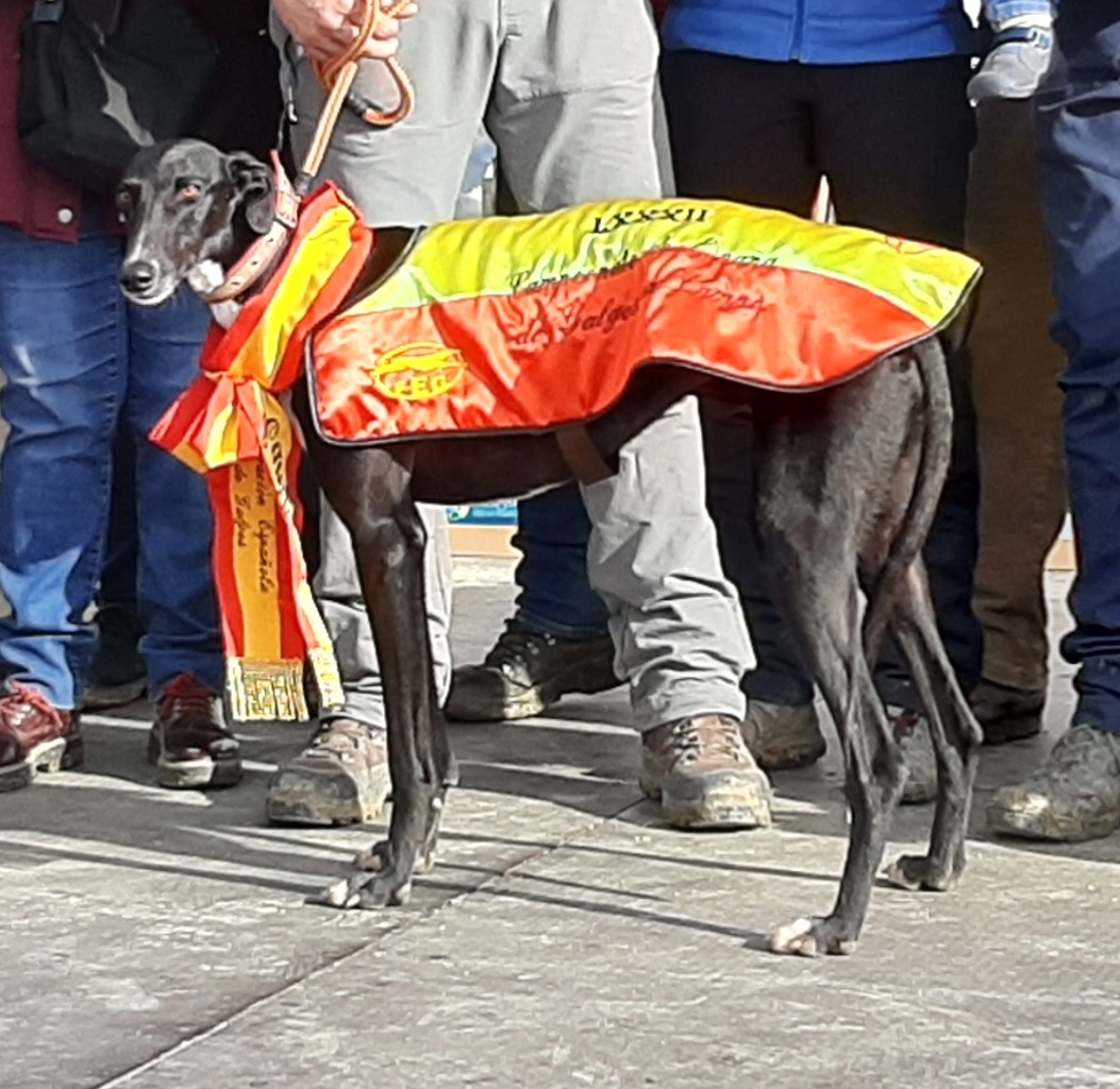 Venía invicta del regional. En el Nacional ha disputado 13 carreras 10 válidas y 3 nula, de las que ha ganado 8 y ha perdido 2. Ha sumado detrás de las rabonas un tiempo de 23:37 lo que supone un tiempo medio por carrera de 1:49. Es la perra más castigada en cuanto a minutos corridos y a la que más le han durado las liebres de este nacional.