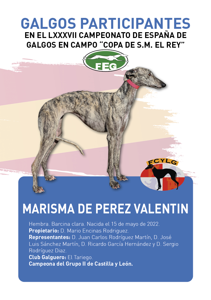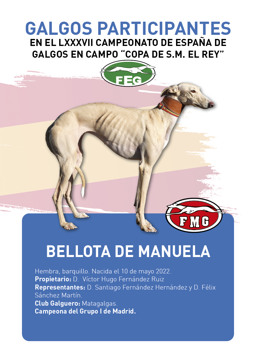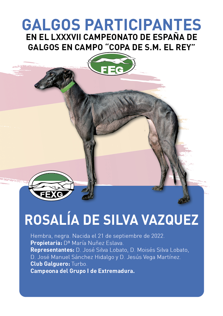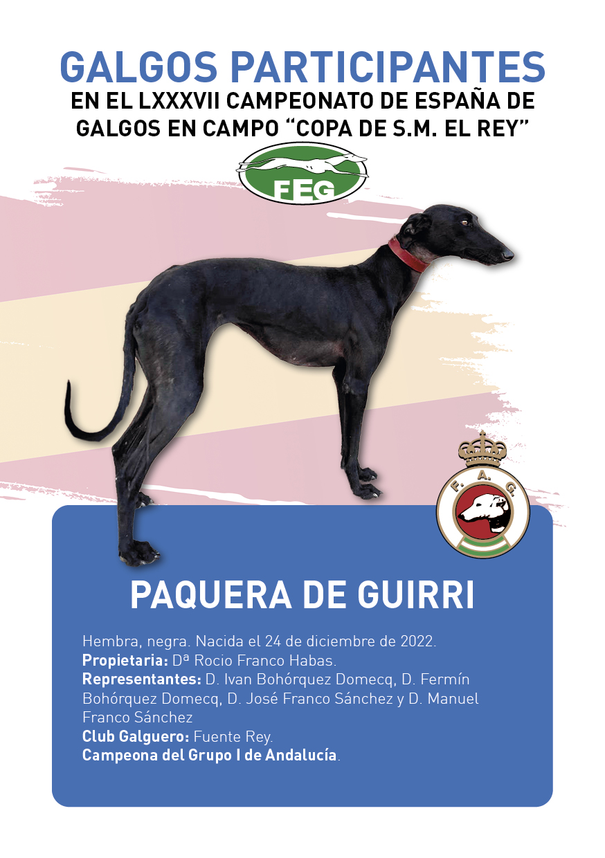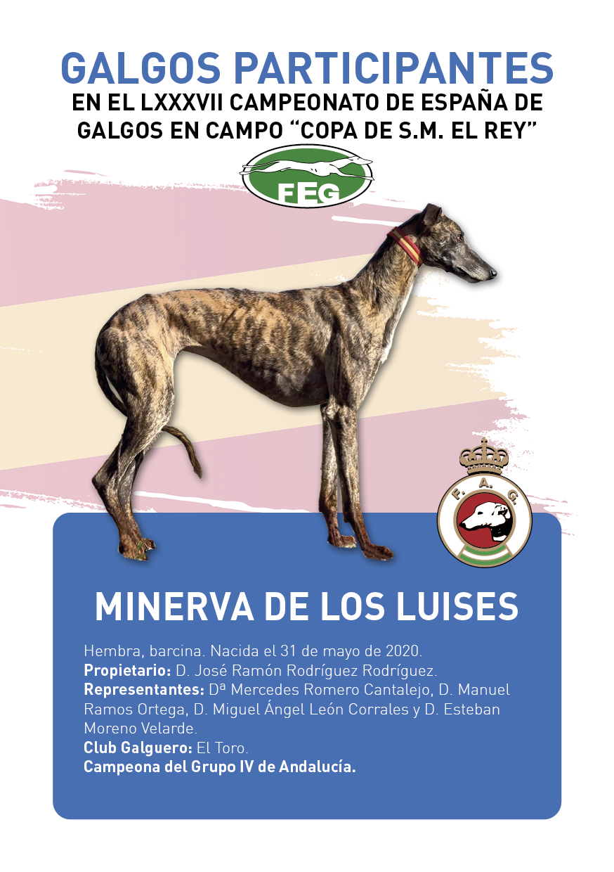 Venía invicta del regional. En el Nacional ha disputado 13 carreras 10 válidas y 3 nula, de las que ha ganado 8 y ha perdido 2. Ha sumado detrás de las rabonas un tiempo de 23:37 lo que supone un tiempo medio por carrera de 1:49. Es la perra más castigada en cuanto a minutos corridos y a la que más le han durado las liebres de este nacional.