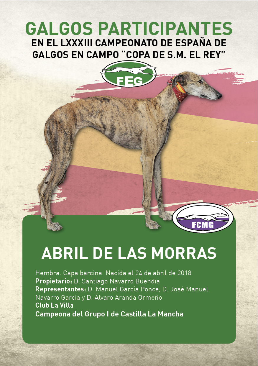 El LXXXVIII Campeonato de España de galgos en Campo Copa de S.M El Rey, tendrá asignados dos correderos. Uno para OCTAVOS DE FINAL en Castilla la Mancha, en la localidad toledana de Mora, en un precioso cercado deportivo con todos los requisitos para ver un bonito espectáculo.