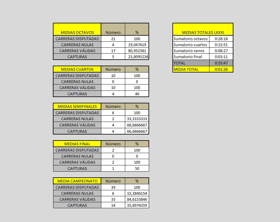 El sumatorio total de tiempo ha sido de 40 minutos y 38 segundos, lo que supone un tiempo medio por carrera de 59 segundos.