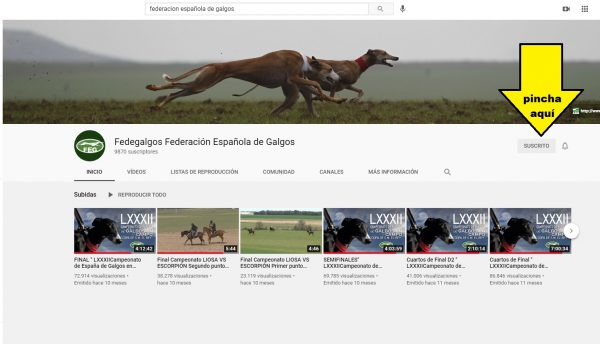- En el buscador de youtube introduce «federación española de galgos» y les llevará a nuestro canal. https://www.youtube.com/user/fedegalgos