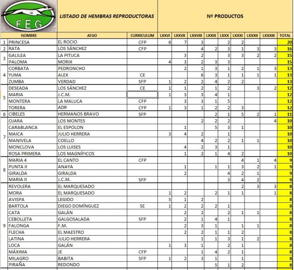 Hoy vamos a presentar el Ránking de las hembras reproductoras, tanto de la presente temporada 2020/2021 como el TOP 25 de los cuatro años que llevamos realizando esta estadística. En reproductoras se realiza un Top 25, porque son mucho menos productos los que una hembra puede dar al año y al final de su ciclo reproductivo, en comparación a los sementales que pueden dar cientos de productos en un mismo año.