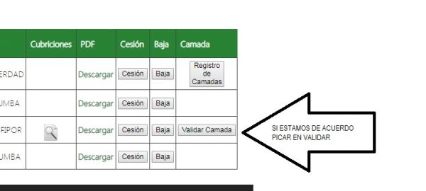 - En ese mismo momento el propietario del macho, en sus productos, le aparecerá un botón en el semental correspondiente que pondrá «VALIDAR CAMADA». Al picar sobre el mismo le aparecerá la misma camada que introdujo el propietario de la hembra. La revisará atentamente y si está de acuerdo, en la parte inferior picará el botón que dice «VALIDAR CAMADA» que servirá como firma de consentimiento para que la camada sea registrada en el LRO. NOTA IMPORTANTE: Si pasa más de un mes desde el registro de la camada por parte del propietario de la hembra y el propietario del macho no la valida, la camada en cuestión quedará anulada.