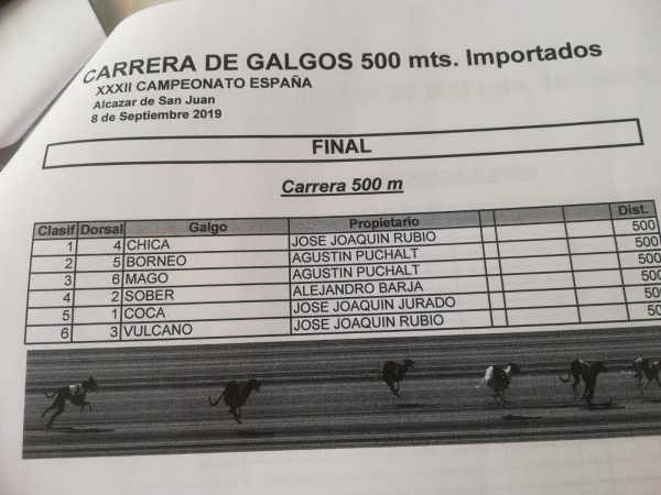 «Chica» de Jose Joaquín Rubio fue campeona, «Borneo» de Agustín Puchalt fue Subcampeón añadiendo este subcampeonato a su impresionante curriculum de victorias de campeonatos que trae de Irlanda e Inglaterra este espectacular galgo ingles. Tercero fue «Mago» también de Agustín puchalt. Cuarto fue «Sober» de Alejandro Barja . «Coca» el actual subcampeón de España también falló en la final y no pudo escalar al pódium y solo pudo ser quinto. El sexto puesto lo completó Vulcano de Jose Joaquín Rubio.