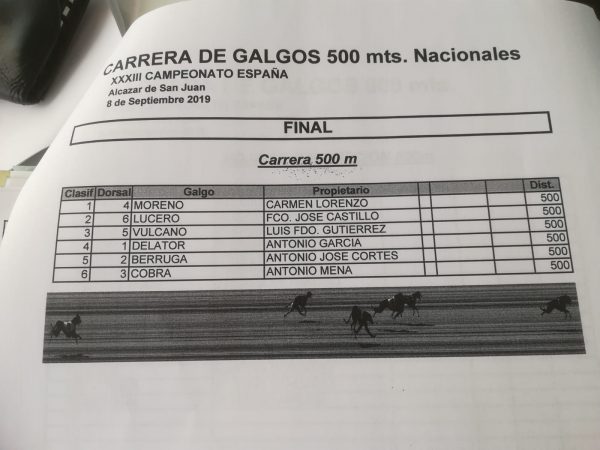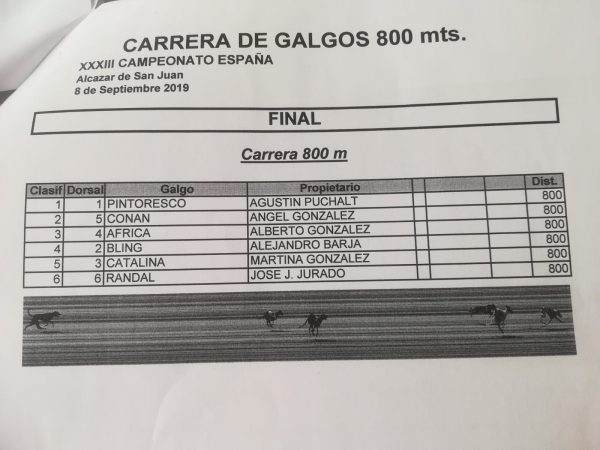 «Pintoresco» propiedad de Agustín Puchalt y Subcampeón de España 2018, en este 2019 consiguió el título brillantemente demostrando ser el mejor fondistas del panorama nacional . Subcampeón fue «Conan» propiedad de Angel Gonzalez, actual campeón de España en el 2018, este año ha sido subcampeón intercambiándose las posiciones con pintoresco. «Africa» de Alberto Gonzalez completó el pódium y fue la única galga nacional que pudo entrar en la final entre tantos especialistas de larga distancia importados. Cuarta fue «Bling» de Alejandro Barja . «Catalina» de Martina Gonzalez fue quinta clasificada. «Randal» propiedad de Jose Joaquín Jurado fue sexto y repitió final nacional por segundo año consecutivo.