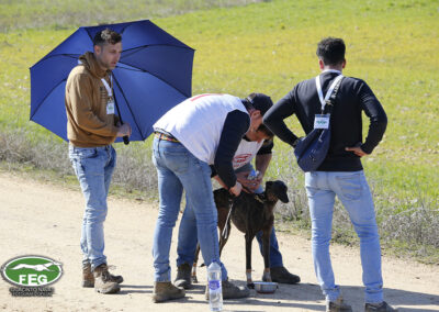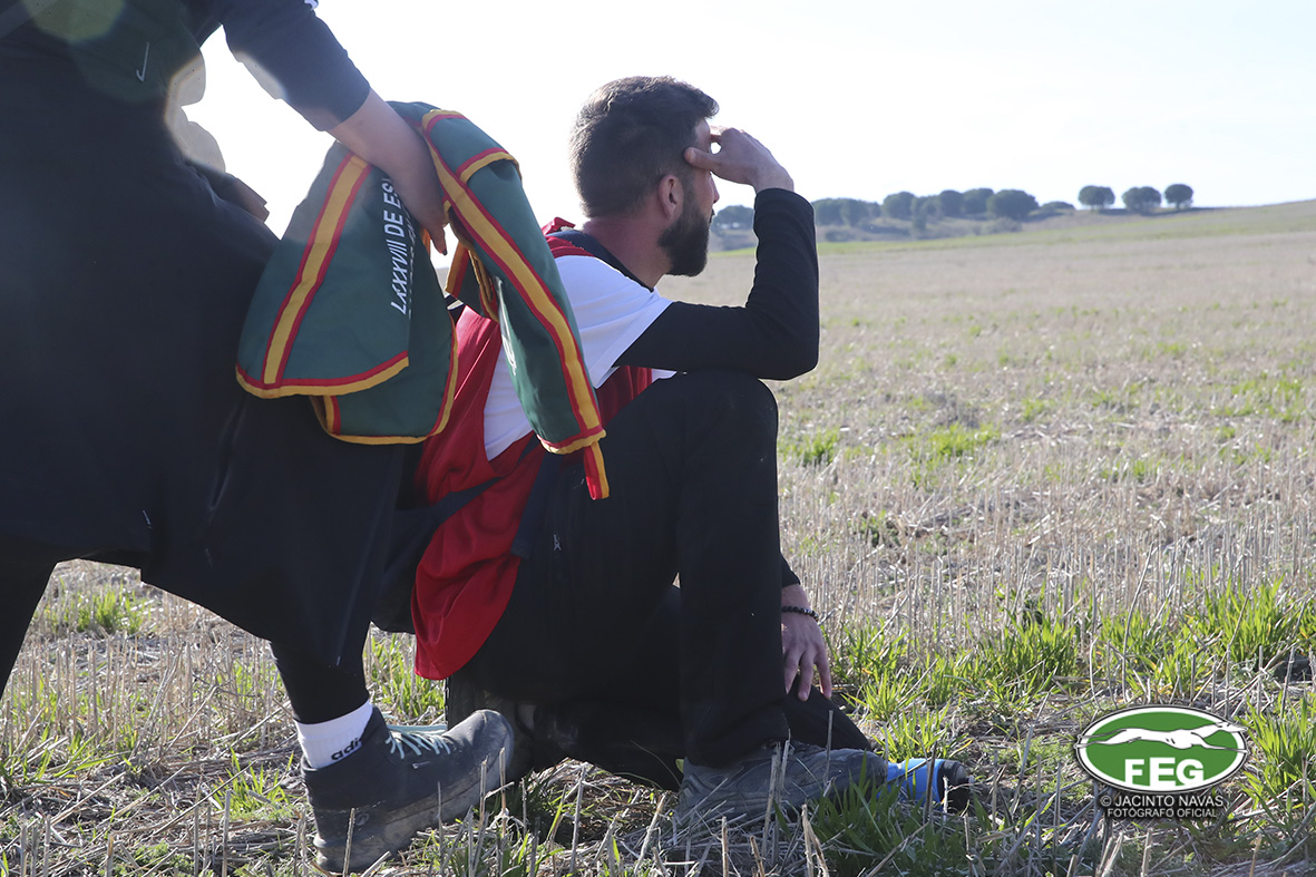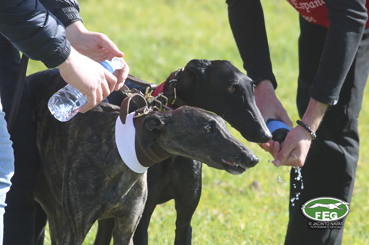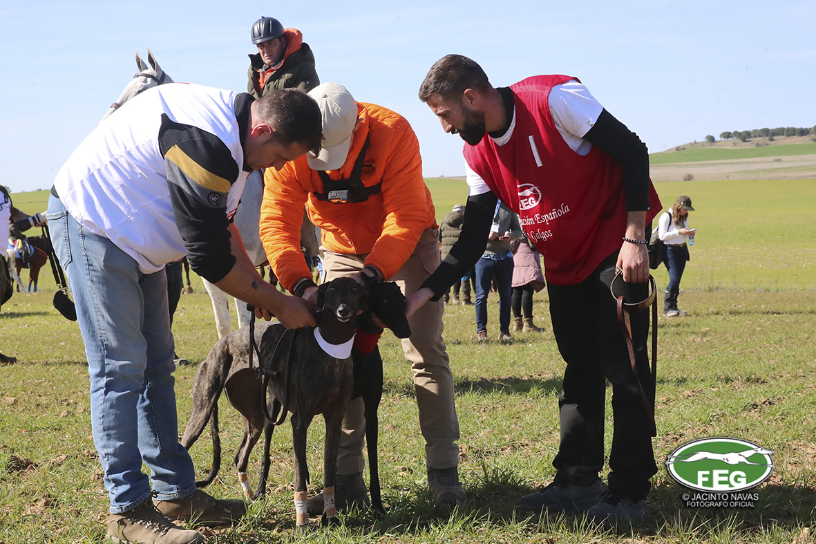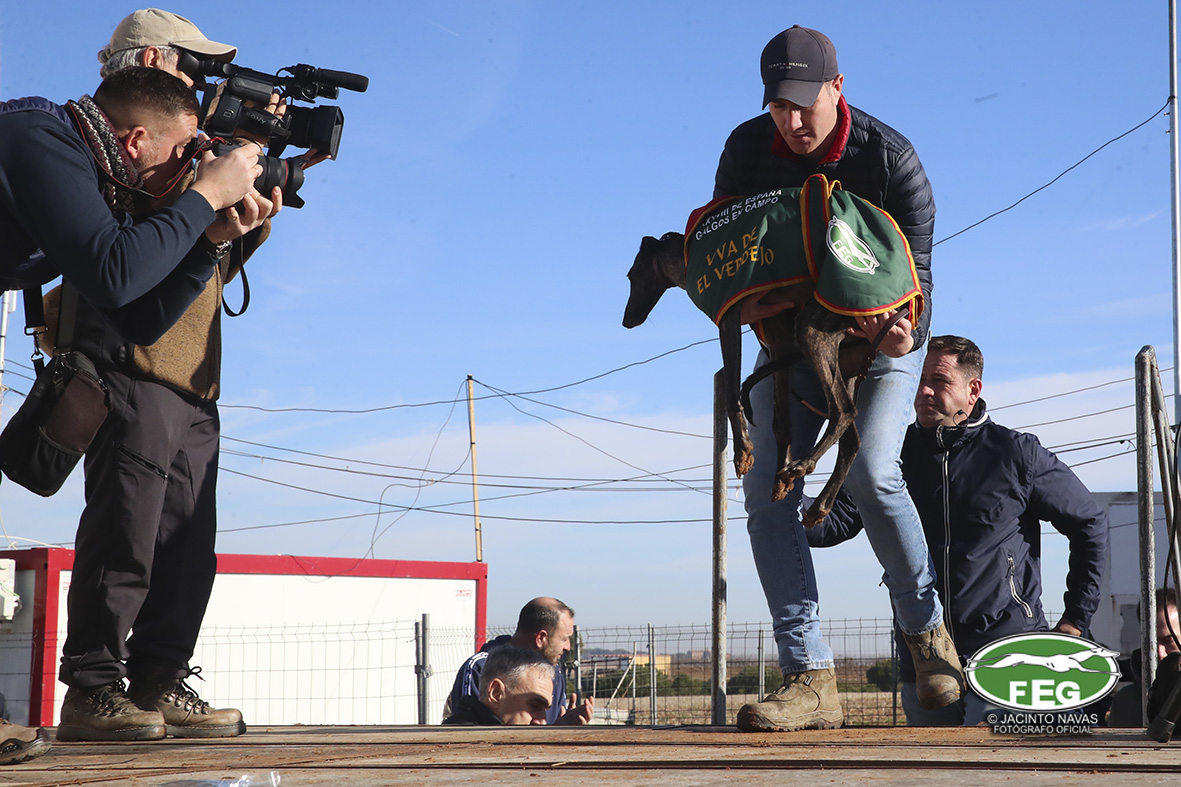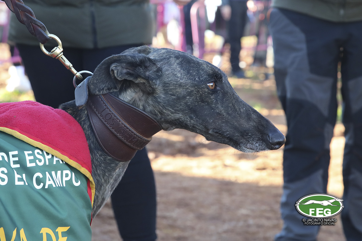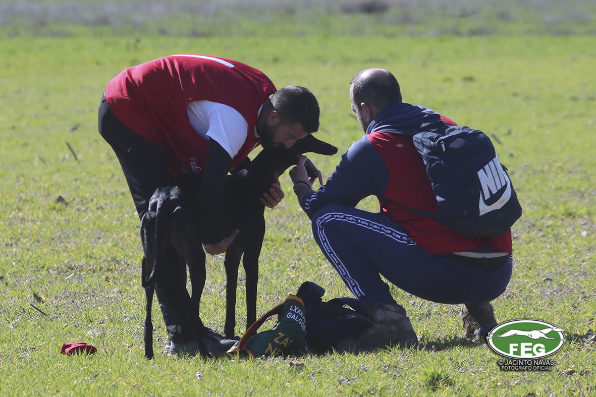 Con las perras muy mermadas ya por el estado exigente del terreno, el calor y sin duda, los más de 5 minutos que llevaban ya en competición, los veterianrios oficiales deben atender acerdamente a la repreentante castellana, que presenta un pinchazo interdigital en una de sus manos que la limita al menos a simple vista, su funcionalidad. Tras la intervención de los facultativos que vendan incluso al animal, las perras vuelvan a entrar en traílla, para regalar a la afición una de las carreras con más emoción en una final de los últimos años. Al final de la carrera dos pañuelos para Zaína y uno para Uva, con un crono superior a los 3 minutos y medio, que los jueces recortaban con una doble pitada en 3:18, lo que suponía el punto, la eliminatoria y la corona de España, para la galga lebrijana.
