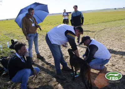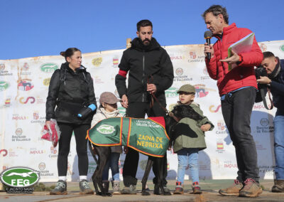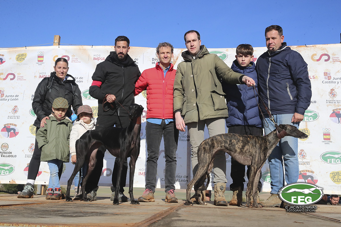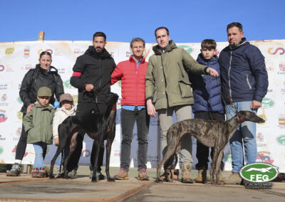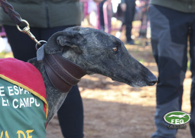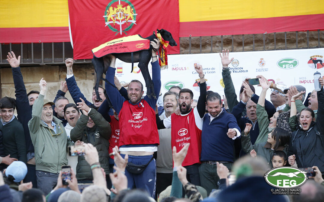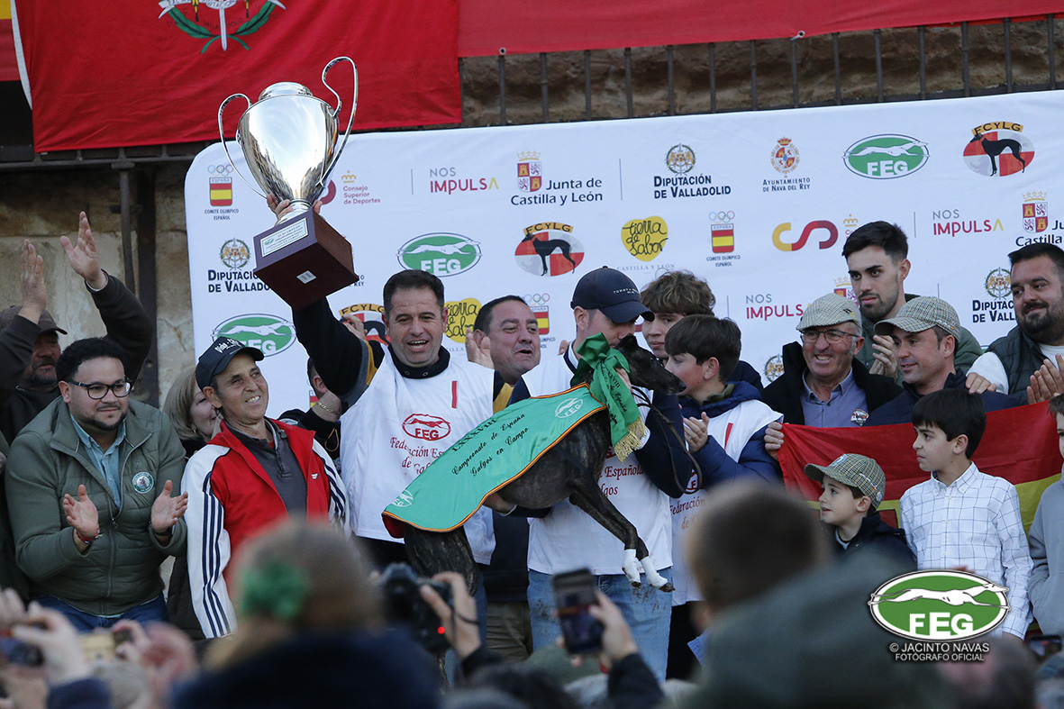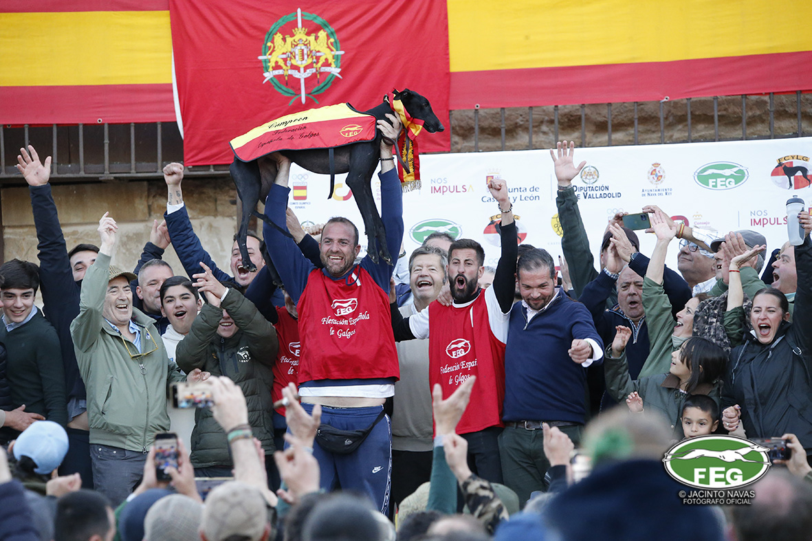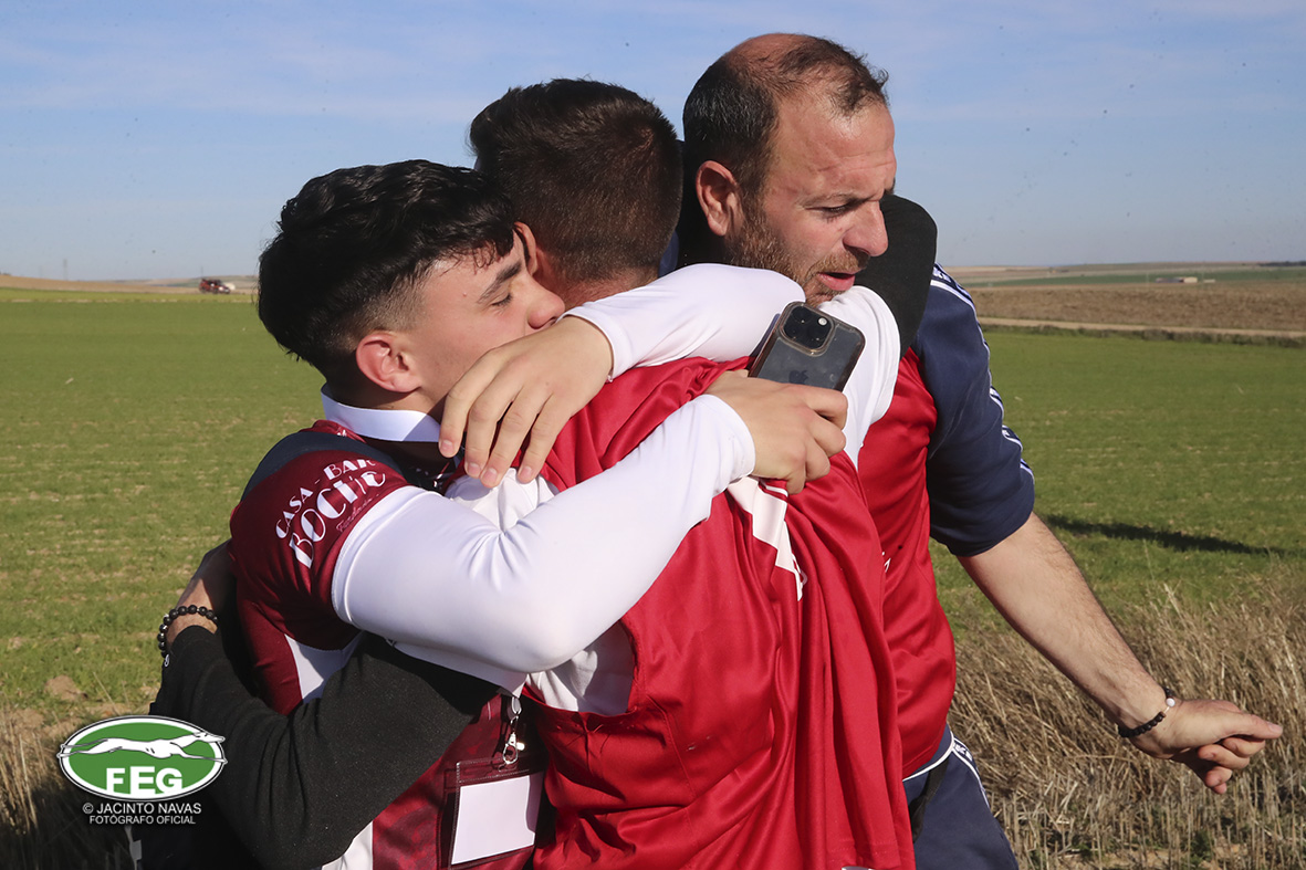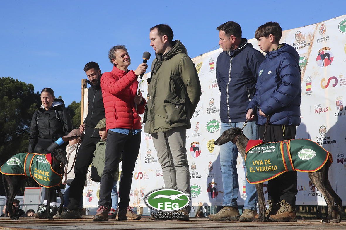 Con las perras muy mermadas ya por el estado exigente del terreno, el calor y sin duda, los más de 5 minutos que llevaban ya en competición, los veterianrios oficiales deben atender acerdamente a la repreentante castellana, que presenta un pinchazo interdigital en una de sus manos que la limita al menos a simple vista, su funcionalidad. Tras la intervención de los facultativos que vendan incluso al animal, las perras vuelvan a entrar en traílla, para regalar a la afición una de las carreras con más emoción en una final de los últimos años. Al final de la carrera dos pañuelos para Zaína y uno para Uva, con un crono superior a los 3 minutos y medio, que los jueces recortaban con una doble pitada en 3:18, lo que suponía el punto, la eliminatoria y la corona de España, para la galga lebrijana.